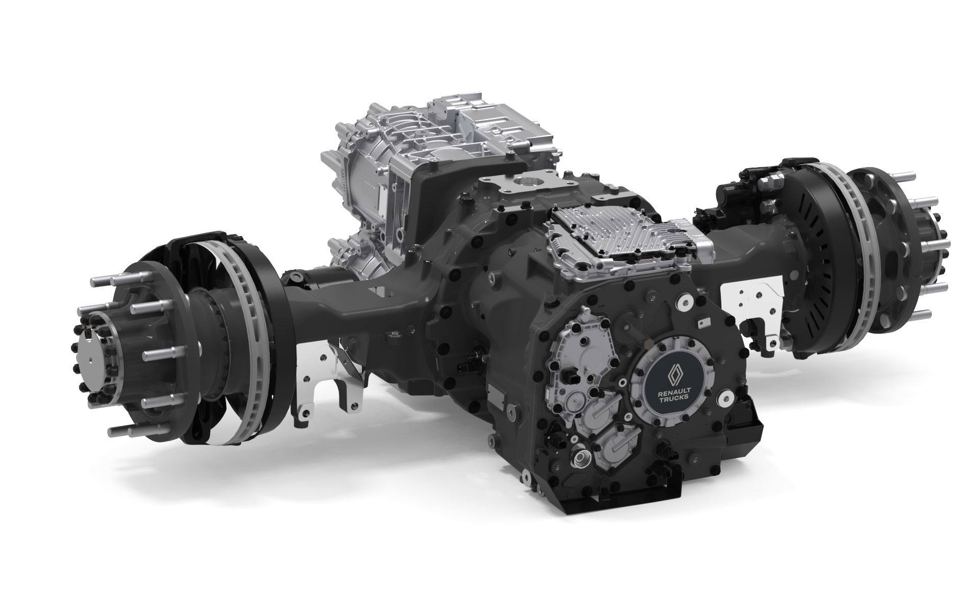 E-ašies technologija viename komponente apjungia visus transmisijos elementus – elektrinius variklius ir pavarų dėžę. Ji montuojama galinėje sunkvežimio dalyje ir suteikia daugiau erdvės papildomiems baterijų blokams montuoti ant rėmo. Numatoma, kad tai „Renault Trucks E-Tech T“ leis nuvažiuoti iki 600 km su viena įkrova.